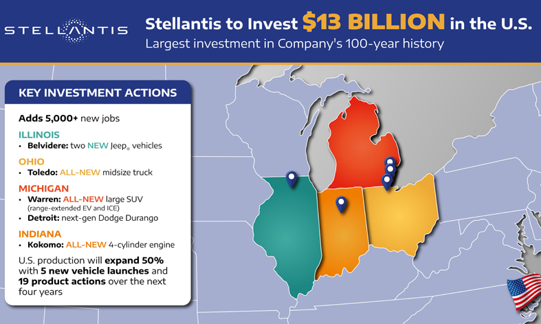 Ohio: Yaklaşık 400 milyon dolarlık yatırım ile daha önce Belvidere tesisine tahsis edilen tamamen yeni orta boy pick-up modelinin üretimi Toledo Montaj Kompleksi’ne taşınacak. Bu tesis, hâlihazırda Jeep Wrangler ve Jeep Gladiator modellerini üretiyor. Üretim değişikliğinin 900’den fazla yeni iş imkânı oluşturması bekleniyor. Üretim başlangıcı 2028 olarak planlanıyor. Ayrıca şirket, Toledo operasyonlarına daha önce ocak ayında duyurulan yatırımları sürdürmeyi planlıyor. Bu kapsamda, Jeep Wrangler ve Jeep Gladiator modelleri için ek teknolojiler ve ürün geliştirmeleri, ayrıca Toledo İşleme Tesisi’nde üretim için kritik yeni donanımların eklenmesi yer alıyor.