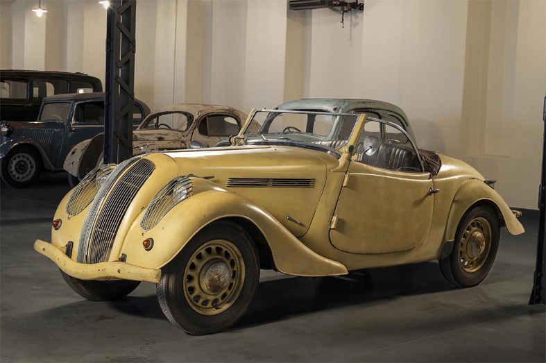 Bir diğer dikkat çekici model olan Popular Roadster Deluxe, çarpıcı Monte Carlo gövdesi ve mavi-gri metalik rengiyle sergide özgün haliyle yer alıyor. 1936 Prag Otomobil Fuarı için özel olarak üretilen bu otomobilin kaputunda, o dönemin izleri hâlâ görülebiliyor.